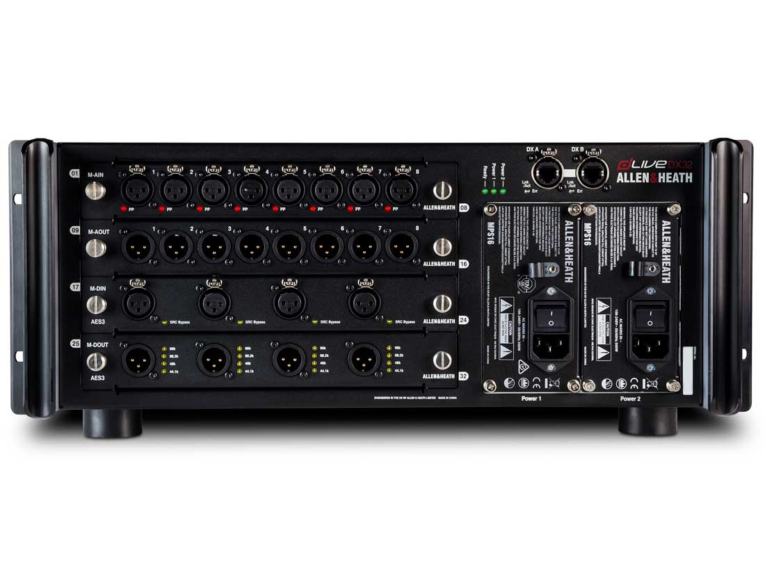 Up to 2 DX32 Expanders can be connected directly to a dLive MixRack, and a further DX32 can be connected to the Surface. More units can be added to a dLive system via a DX Link card or DX Hub.