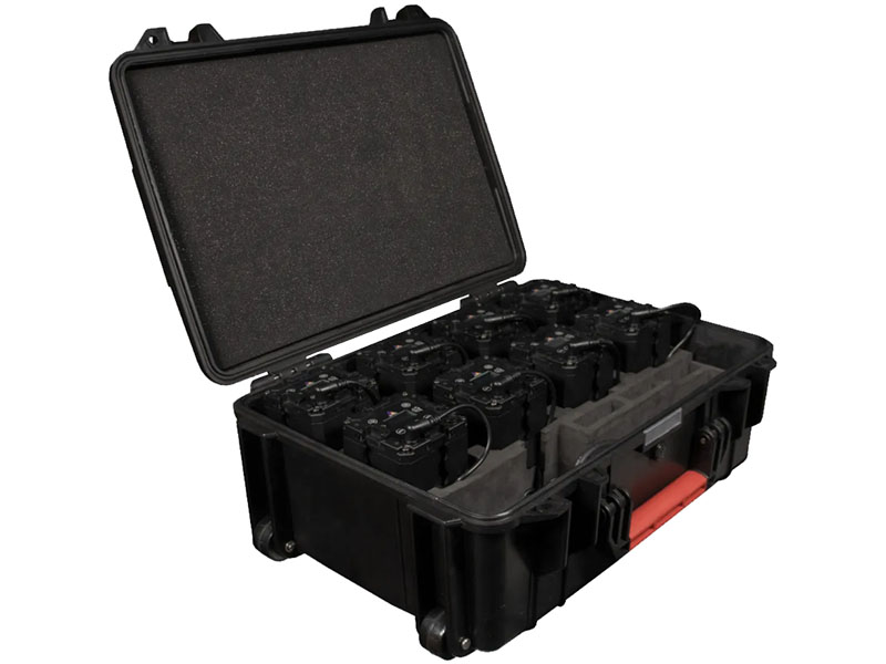 Kit of 8 PixelBricks with essential accessories stored in a durable protective plastic case with wheels and retractable handle. With the included PowerBox you can charge your lights in the case to get them ready for their next job. For longer installations, the PowerBox can be taken out of the case to supply power and data via the optionally available Power/Data Combination cables.