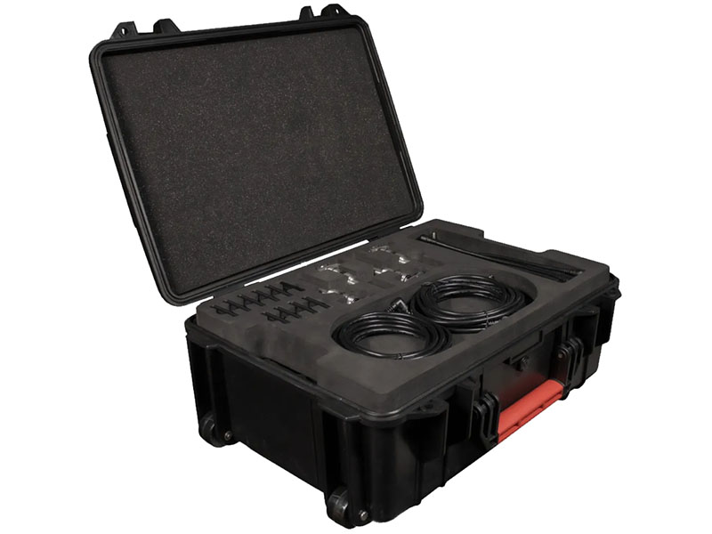 Kit of 8 PixelBricks with essential accessories stored in a durable protective plastic case with wheels and retractable handle. With the included PowerBox you can charge your lights in the case to get them ready for their next job. For longer installations, the PowerBox can be taken out of the case to supply power and data via the optionally available Power/Data Combination cables.