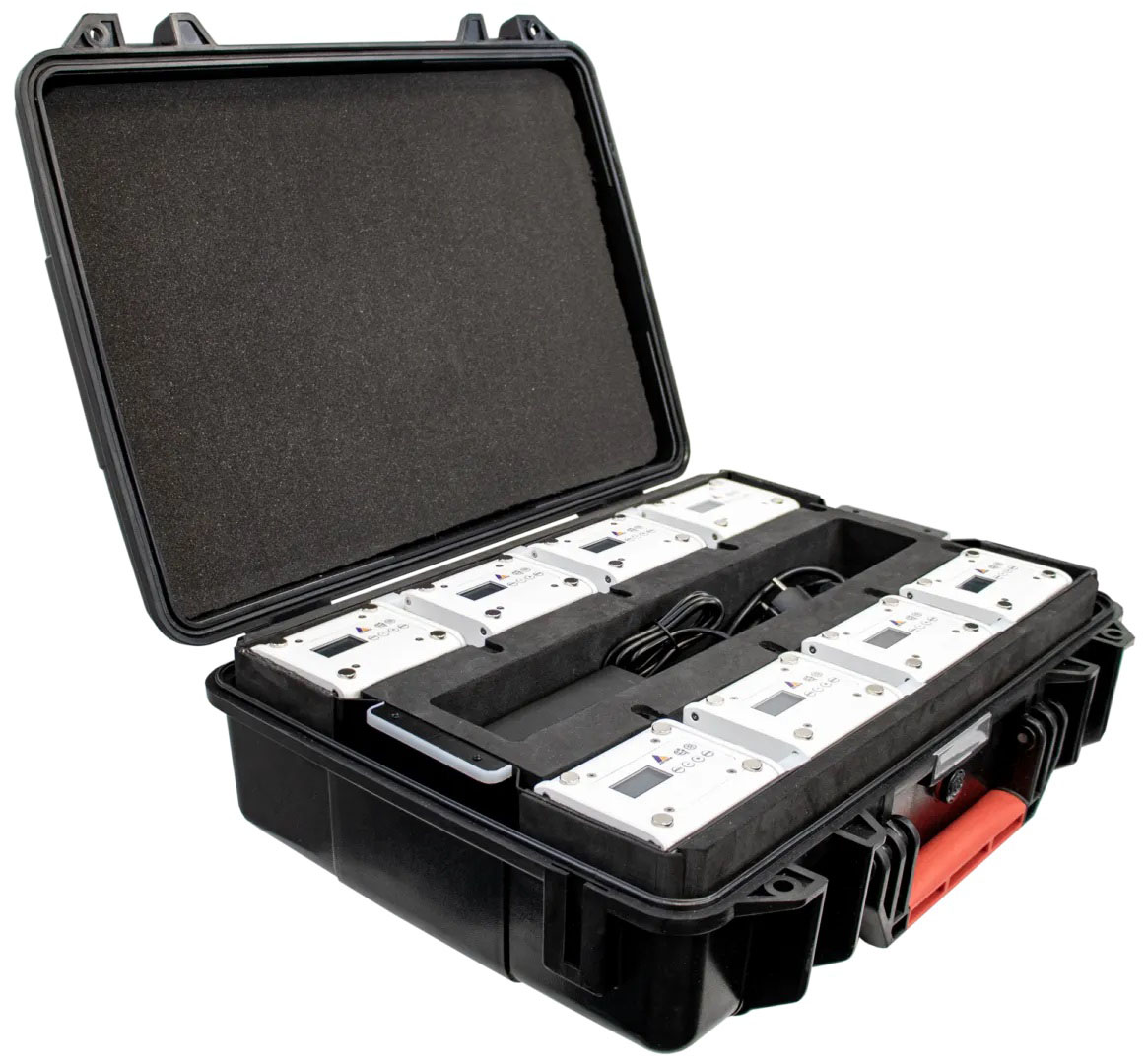 Set of 8 PowerStations with all essential accessories stored in a durable protective plastic case. Included are 8 TrackPins, 8 PowerStation Hangers, a 24 VDC power supply with power distribution to charge all 8 PowerStations from one AC outlet, and 8 BridgeCables to connect 8 NYX Bulbs simultaneously.