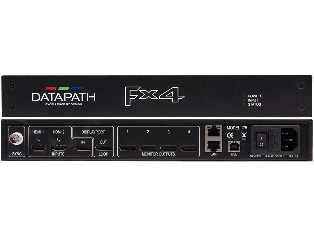 The Datapath Fx4 is a multi-faceted stand alone display controller that supports a choice of inputs, high bandwidth loop-through as well as 4 genlocked outputs in either DisplayPort or HDMI.