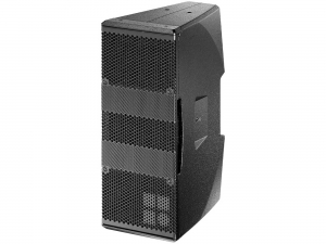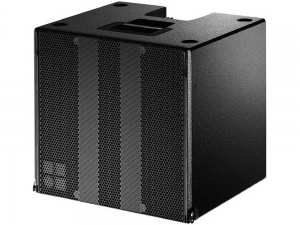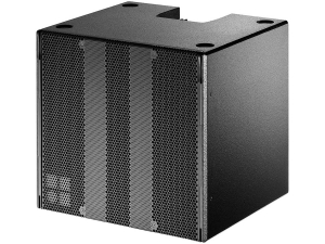 The T-SUB is an actively driven bass-reflex loudspeaker fitted with a high excursion 15" driver. d&b SenseDrive technology is available when powered by the D12 amplifier. It can be used to supplement the LF headroom of the T10 loudspeaker in various combinations, ground stacked or flown, either integrated on top of a T10 array or as a separate column. The loudspeakers are mechanically connected using rigging links on both sides of the cabinet front, which slide out when needed, and with a central splay link at the rear of the cabinet.