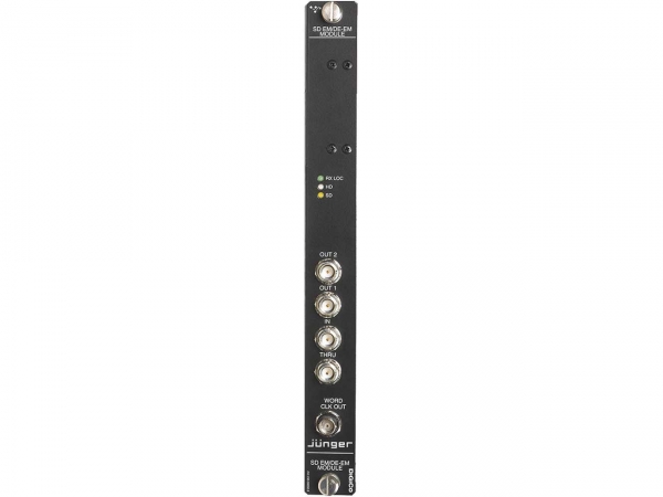 The HD-SDI card allows audio to be de-embedded and then re-embedded any 8 of the 16 channels of AES3 audio contained within an SDI video stream. The card contains inbuilt sample rate conversion so that it can be used at both 48kHz and 96kHz. The card is compatible with SMPTE 272M-A, C (SD) and SMPTE 299M (3G, HD) and is transparent for Dolby E/D data. On the front panel are 5 BNC connections: In, Thru (re-clocked SDI in), two identical outputs from the embedded, and a 48kHz Word Clock from the SDI stream.
