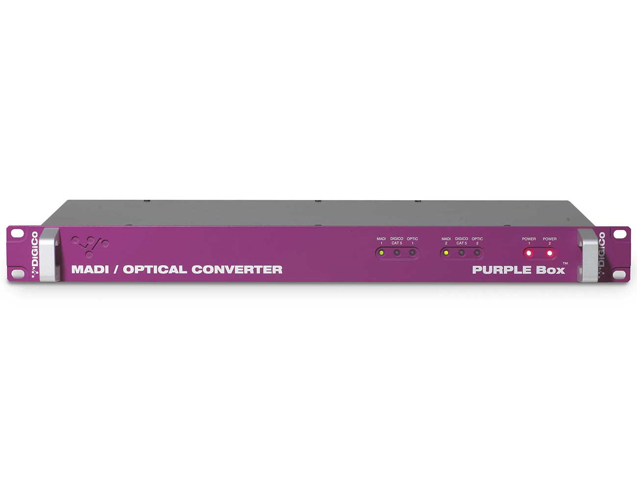 The DiGiCo Purple Box is a CAT5/MADI to optical convertor, primarily for the transmission of high channel count MADI signals over a long distance. Capable of taking either a MADI or CAT5 connection from an SD or S-Series Console, or a D-Rack or D2-Rack, the Purple Box converts these MADI based signals to an optical format for transmission over fibre. Purple Box allows any combination of two MADI or D-Rack streams to be converted simultaneously.Purple Box has 128 available channels and has completely independent I/Os convertors within the box, the only commonality being the power supplies, two of which are supplied for redundancy.