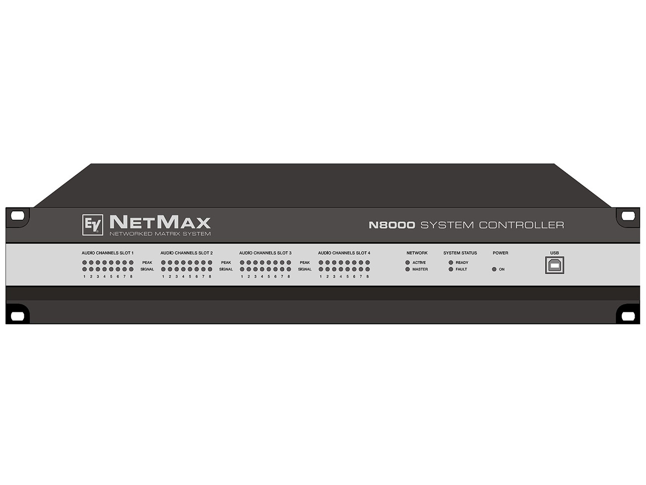 The central unit of NetMax is the N8000 system controller with up to 32 audio channels, mixer and matrix functions, signal processing and extensive control and monitoring functions. Several N8000 can be connected via a CobraNet™ audio and control network so that a large, decentralized audio system can be assembled.