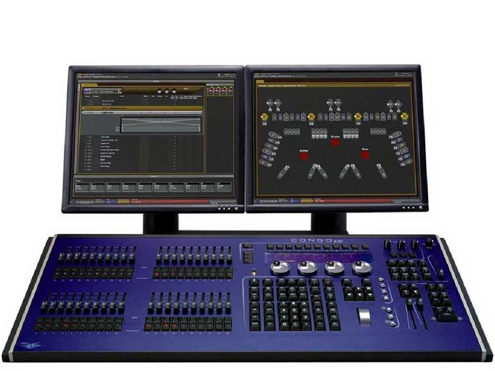 Congo Kid® powered by Cobalt™ software is a small-venue solution for smaller lighting rigs that include conventionals, LEDs, moving lights and small media servers. The console supports up to two external DVI monitors that can be single- or multi-touch. Congo Kid powered by Cobalt controls 256 or 512 devices (dimmers, LEDs, moving lights or media servers) on two universes of output (1,024 parameters). It can be used as a backup or client to any other Cobalt-family controller up to the capacity of the console.