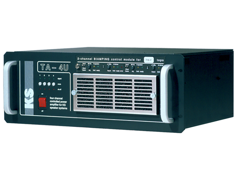 The T Line is powered by the KS Audio 4-channel TA 4D amplifier. Two channels in bi-amp mode can power two T Line cabinets; two TA 4D amplifiers, therefore, can power an 8 box array.