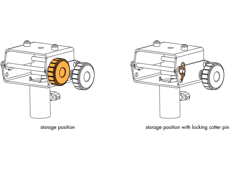 The enclosure knob can be stored in an insert on the side.The angle axis is secured with a threaded knob. To optimize visual impact, the knob can be replaced by a locking cotter pin (provided).