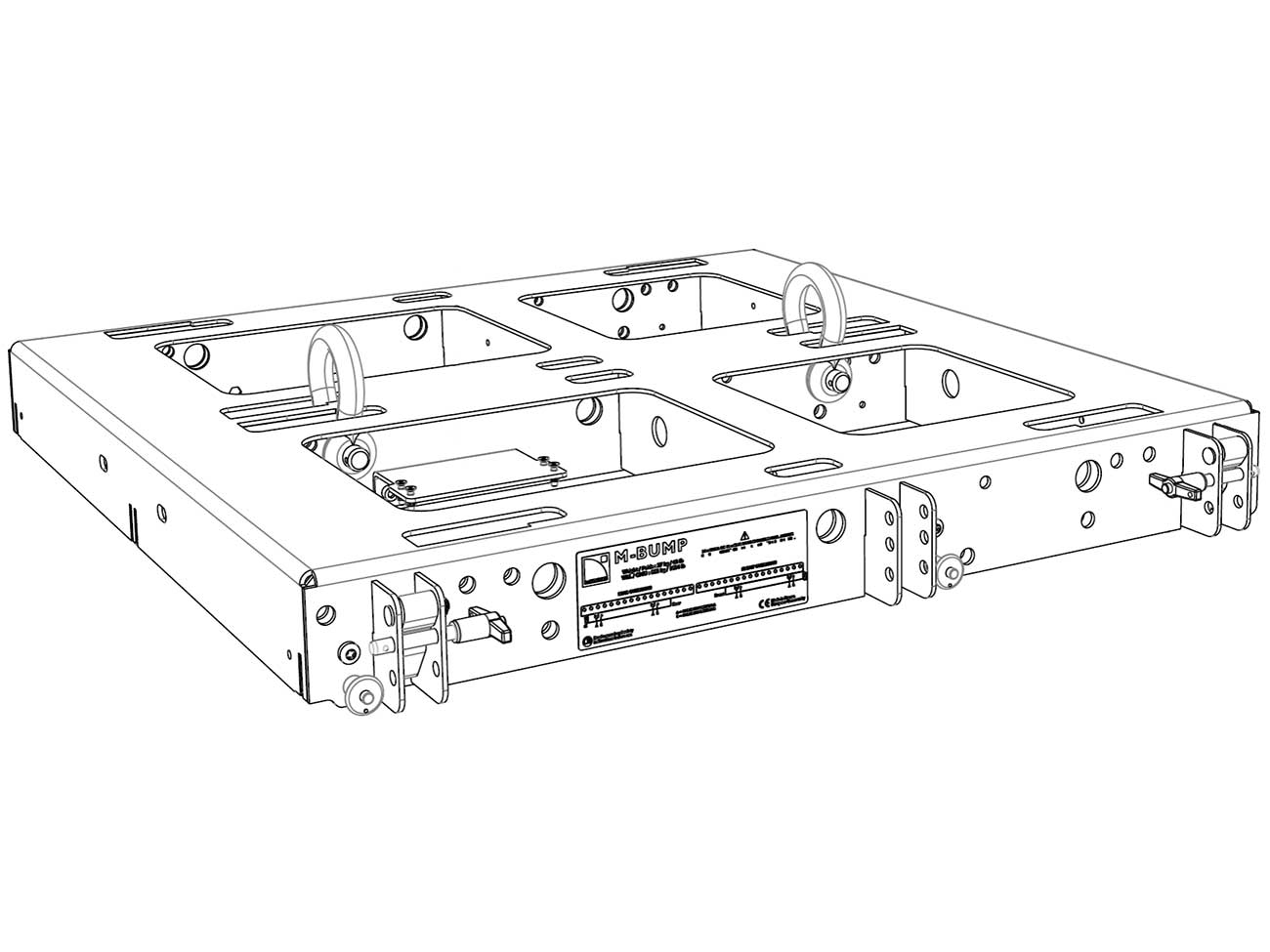 The L-Acoustics M-BUMP rigging structure has been designed to fly or stack the Kara enclosures as a variable-curvature, vertical line source array. M-BUMP also allows Kara to be rigged to an SB18 subwoofer array.The M-BUMP is a square frame fitted with the following elements: