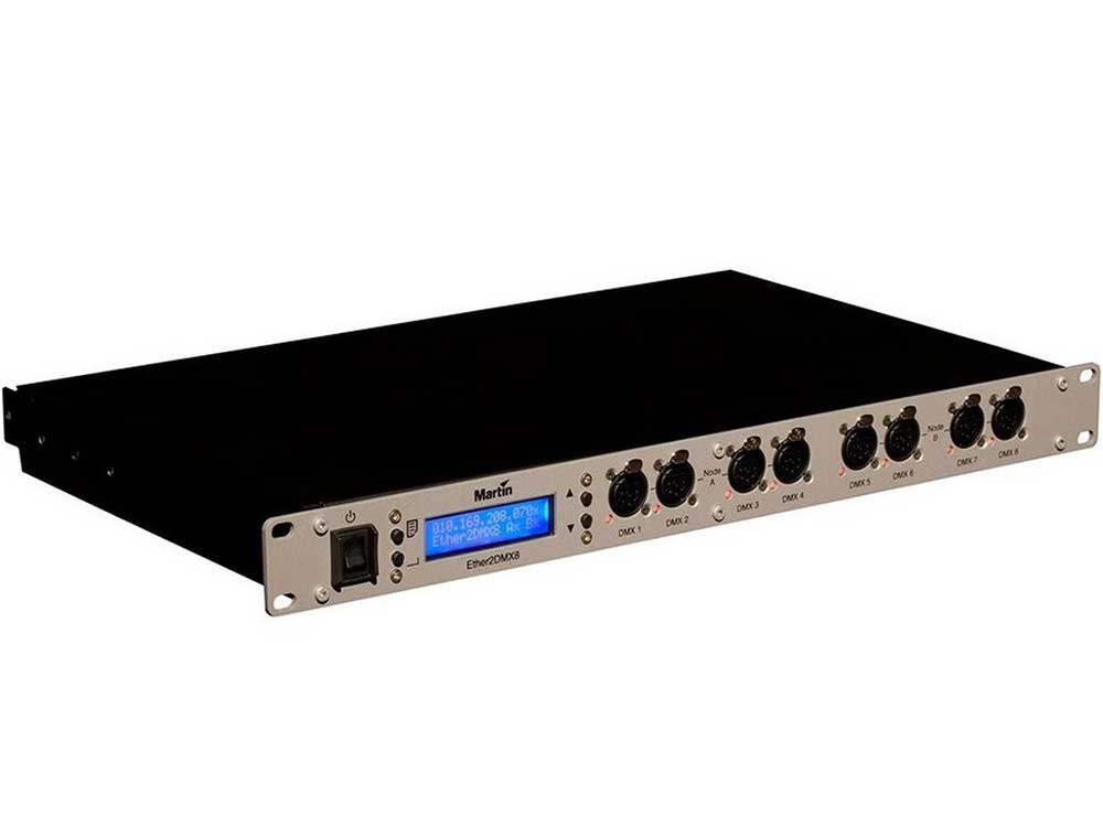 Ether2DMX8 is a highly capable DMX router and much more! As a DMX router, it translates Artnet protocol into DMX in/out universes but can also be used as a DMX merger, DMX splitter hub, fail safe device, cue playback, and DMX viewer monitor. As an extension for the M-Series console it provides 8 DMX ports. When connected to a standalone PC, the Ether2DMX8 also becomes the license key for M-PC and provides 64 DMX Universes.