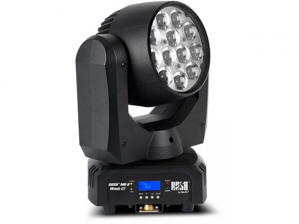 The RUSH MH 6 Wash CT is a bright single-lens LED moving head with fully premixed white color temperatures. With twelve 10W WW/CW (warm white and cold white) LEDs and a 10° to 60° motorized zoom, it offers full electronic dimming and variable strobe effects controlled via DMX.