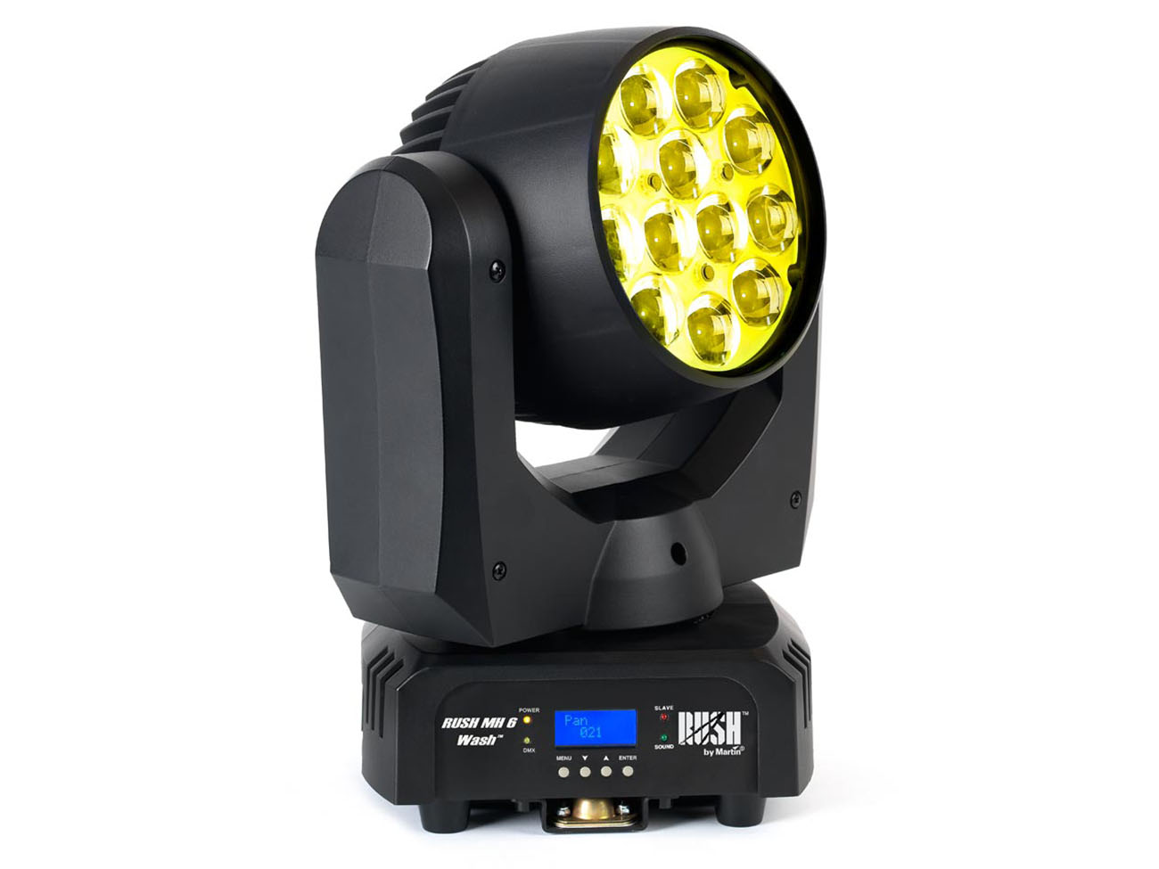 The RUSH MH 6 Wash CT is a bright single-lens LED moving head with fully premixed white color temperatures. With twelve 10W WW/CW (warm white and cold white) LEDs and a 10° to 60° motorized zoom, it offers full electronic dimming and variable strobe effects controlled via DMX.
