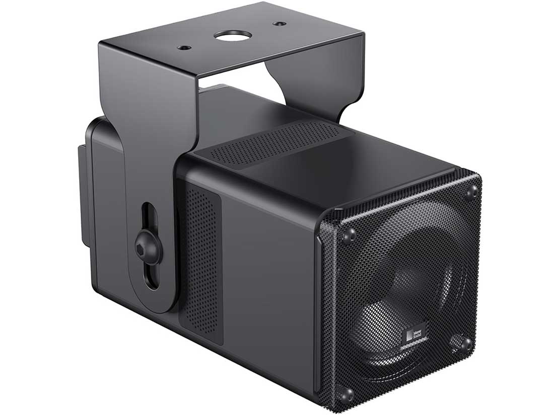 The MM‑4XPD’s extruded aluminum enclosure acts as a heat sink to dissipate heat from the driver’s voice coil. The enclosure is available in a standard black anodized finish with a perforated steel grille. The enclosure can also be custom painted to match specific color schemes. The optional MUB‑MM4XPD U-bracket facilitates mounting of the loudspeaker on walls and ceilings at adjustable angles.