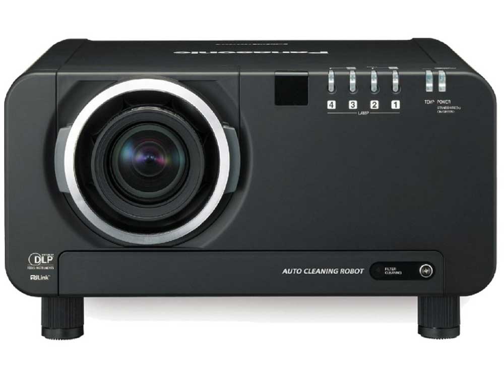 With the PT-D10000 and PT-DW10000 series Panasonic consequently follows the concept of their 3 Chip DLP projectors for highest demand. With the newly developed 4 lamp system this projector gives the ultimate in light output flexibilitly and reliability. Though it keeps easy to carry with only 32 kg of weight. Of course the full range of ET-D75 lenses can be reused in these machines. With the new liquid cooling structure it is now possible to operate the projector with an external temperature of 45°C. The newly developed filter cleaning robot enables the unit to be used for approximately 2.000 hours without cleaning the filter. A webbased control system allows the observation of several installed machines from only one place. Many increasments in the picture output were done: a Dynamic Iris for an increased contrast, a 10 Bit picture processing with 3D colour reproduction for more natural and lively images, progressive cinema scan and a dynamic sharpness control.