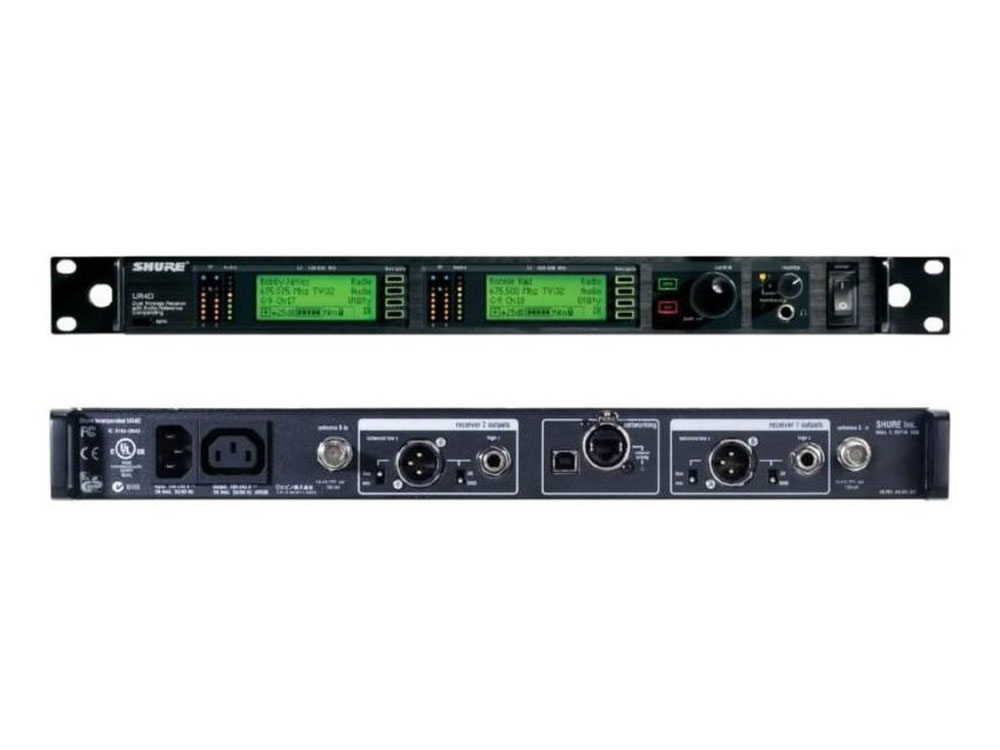 The UR4D Dual Receiver features dual, internal receivers enabling 2 UHF-R series transmitters to Operate simultaneously. The UR4D features a diversity design that aides in Minimizing Radio Frequency (RF) interference and noise. A backlit LCD provides access to all programmable parameters. Audio outputs include a microphone / line level switchable balanced XLR with ground lift and 1/4" phone connectors. USB and EThernet connections are provided for direct integration with a PC and network arrays.