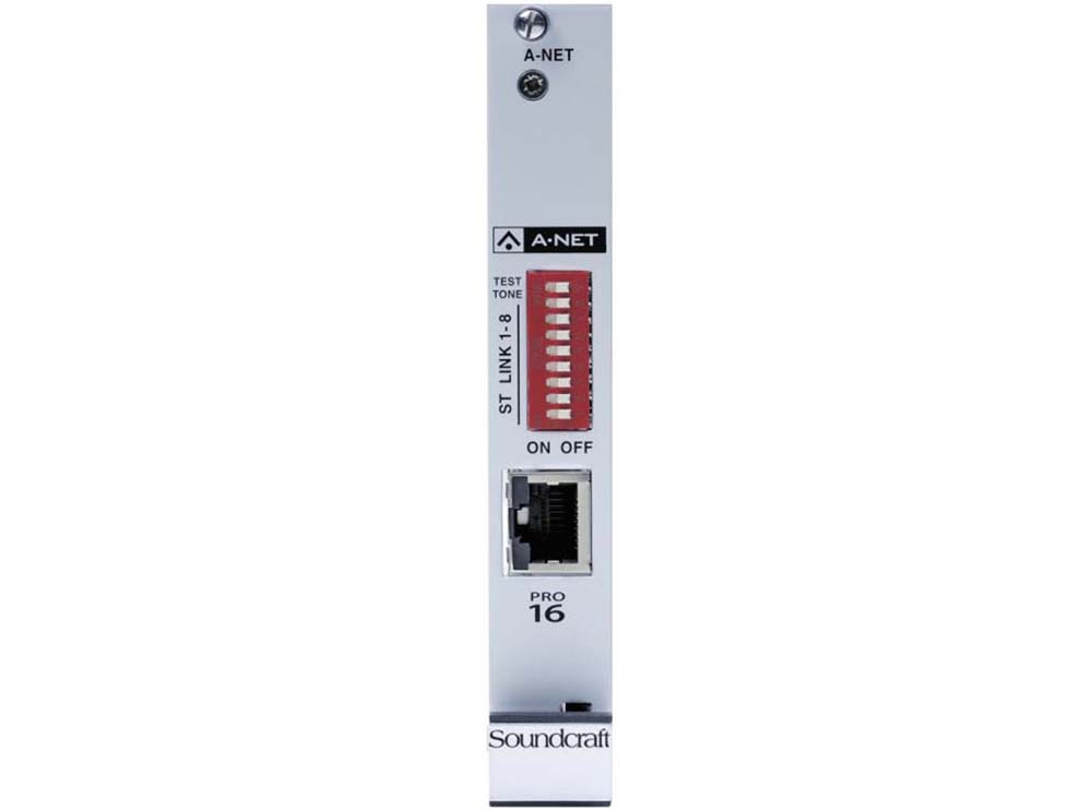 The D21m A-Net card will be the start of the chain and provide the audio and synchronization data to the chain. DIP switches on the front panel allow grouping two adjacent channels to one stereo channel, and generating a test tone.