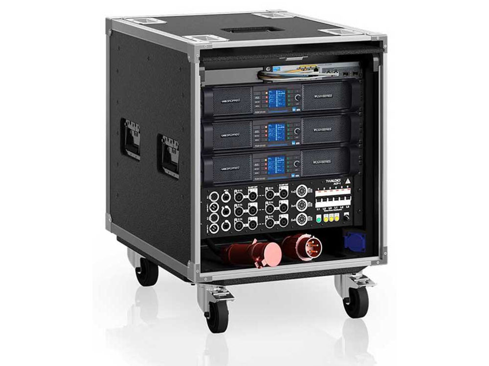 The TOURACK-L contains three Lab.gruppen PLM+ 12K44 amplifiers with an ACP1-L connection panel and a HP/Aruba J9777A switch in our 19" / 10U Rack10T.