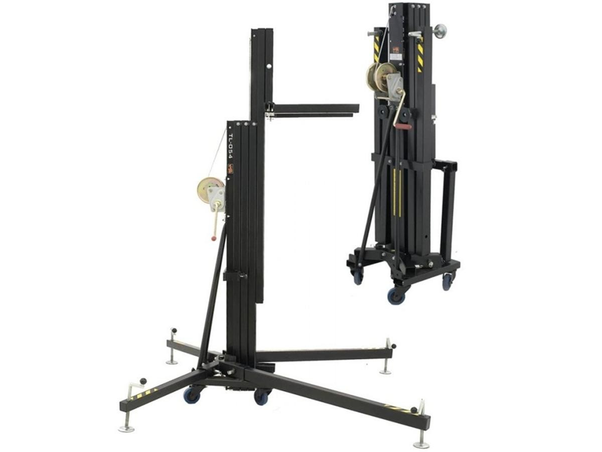 The TL-054 is a compact, front-loading lifting tower designed to raise audio, lighting, or trussing equipment safely and efficiently. It offers a **maximum lifting height of 5.45 meters** and a **load capacity of up to 220 kg**, making it an ideal solution for small to medium-sized event setups.