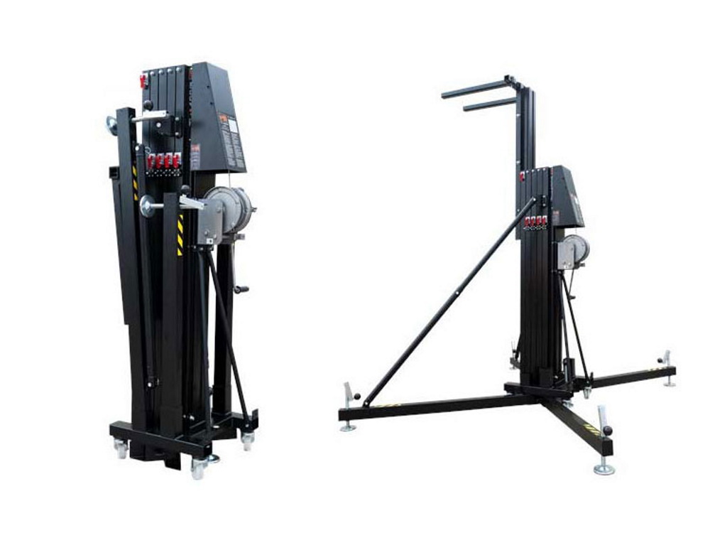 The TL-A400/8 towerlift has been designed for lifting line array audio systems from the ground and keep them fix at high altitude. It has 2 special aluminum straps fixed from the legs to the aluminum base section to reinforced the body of the lifter.